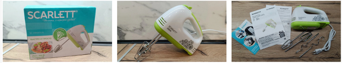 Миксер Scarlett SC-HM40S05 поставляется в фирменной картонной коробке с цветной полиграфией. На бортах коробки можно ознакомиться с внешним видом миксера и краткими техническими характеристиками.