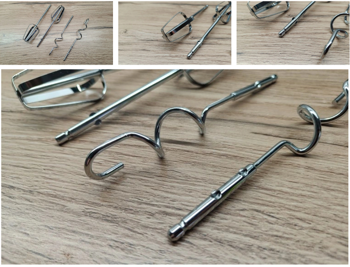 В комплект поставки входит четыре насадки, которые помогут с лёгкостью смешивать продукты различной консистенции. Насадки выполнены из металла и имеют крепёжные элементы для установки в миксере. Если крючки для замешивания теста выполнены из загнутого металлического прута, то насадки для взбивания имеют своеобразную форму. В нижней части насадки лопасти закреплены на заклёпку, а в верхней, удерживаются на точечной сварке. Крепление надёжное и должно выдерживать значительное усилие при взбивании продуктов.