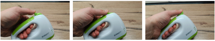 Рядом с ручкой миксера размещается ползунковый переключатель для выбора режима работы, совмещённый с механизмом выталкивания насадок. Для того чтобы извлечь насадки, их не стоит самостоятельно выдёргивать из устройства, проще всего нажать на кнопку и они сами выпадут.