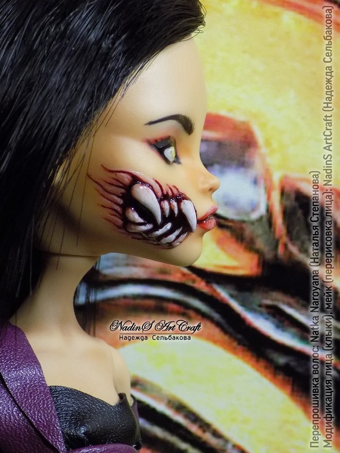 – на лице куклы наклеены клыки из полимерной глины, дёсны прорисованы;