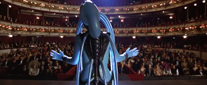 Никто не видел оперную певицу до тех пор, пока занавес наконец не поднялся, и все оказались лицом к лицу с синей инопланетянкой с торчащими отовсюду щупальцами. Выражение удивления на лицах всех присутствующих — это настоящее удивление.