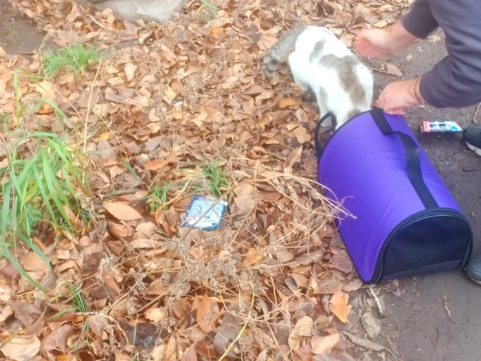 Кот отлично перенес поездку в переноске возможно он не всегда был уличным котом.