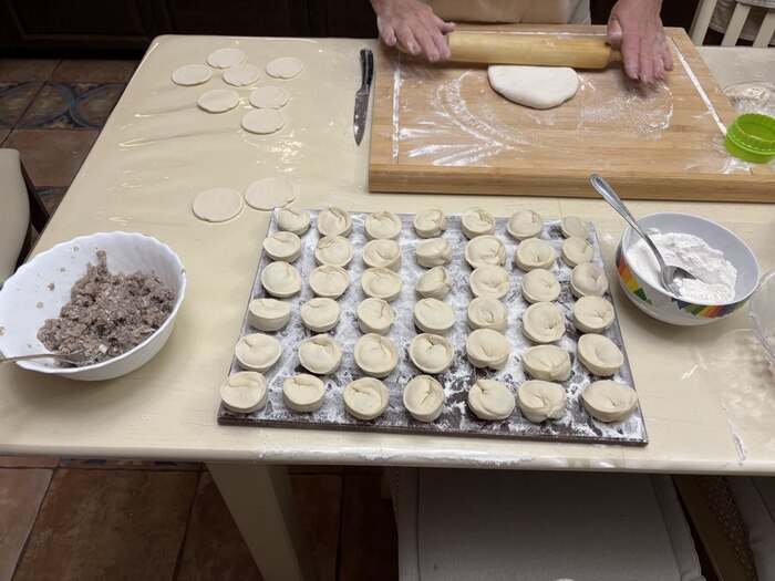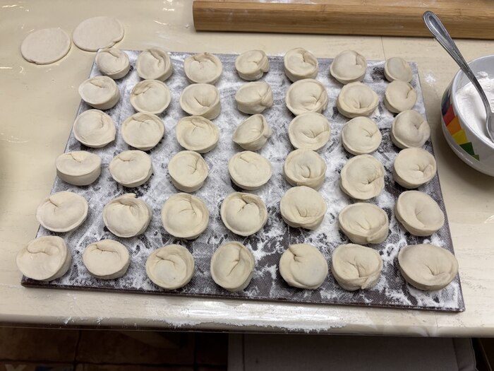 Как только тесто подошло, мы приступили к процессу. Обязанности распределились следуюим образом: жена раскатывает и режет кружочки, я леплю. Первые штук десять сразу же сварили, чтобы проверить соль и перец, ну и выпить стопочку, чтобы лучше лепилось)