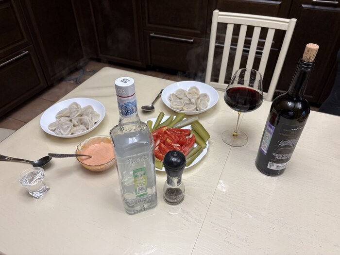 На всё про всё у нас ушло где-то 2.5-3 часа и в результате мы стали обладателями около 200 замечательных, сочных пельменей, которые этим же вечером и опробовали. Жена под красненькое, я под беленькую) Причем, жена так угадала с тестом к мясу, что практически всё закончилось один в один без остатков. Вот, что значит опыт!