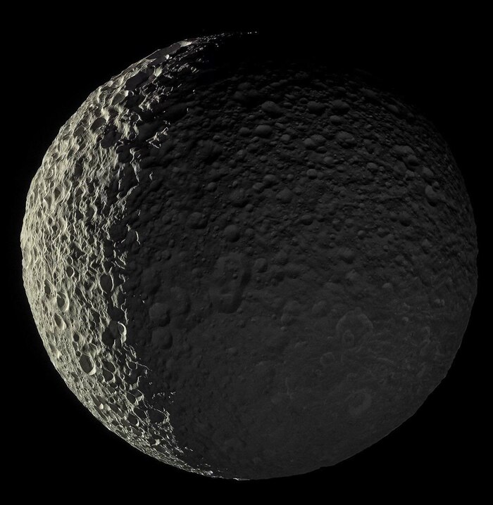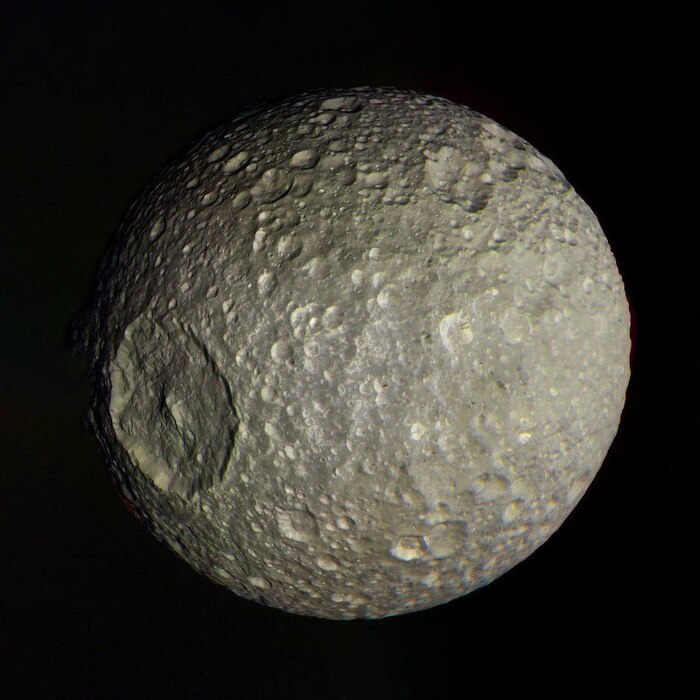Снимки , на которых изображён изъеденный кратерами спутник Сатурна - Мимас. Его диаметр всего 400 км, но примечателен он огромным ударным кратером диаметром 130-140 км, из-за чего напоминает «Звезду смерти».