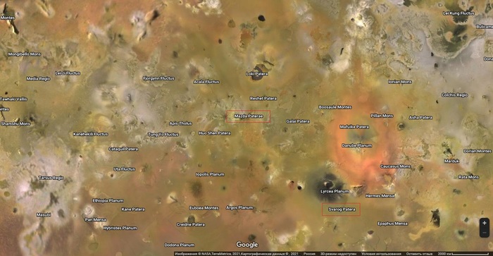 Вулканическая активность Ио - самая интенсивная в Солнечной системе, при этом здесь практически отсутствуют ударные кратеры, что свидетельствует о том, что в геологическом смысле Ио, как и Земля, довольно молод. На поверхности этой луны можно встретить, например, патеру Сварога, патеру Локи, гору Прометея и многие другие имена, известные по мифам различных народов. Каким образом здесь оказалась патера Мазды - загадка :)