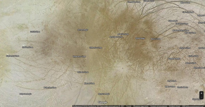 Еще одна луна Юпитера, шестой по удаленности от планеты и наименьший из ее галилеевых спутников. При взгляде на снимок поверхности Европы можно увидеть линии, которые с бодуна можно принять за реки или даже за развитую дорожную сеть, тем более что в некоторых местах вдоль них расположены группы темных объектов, похожие на купола фантастических городов. На самом деле это трещины в ледяном панцире, который покрывает Европу целиком.