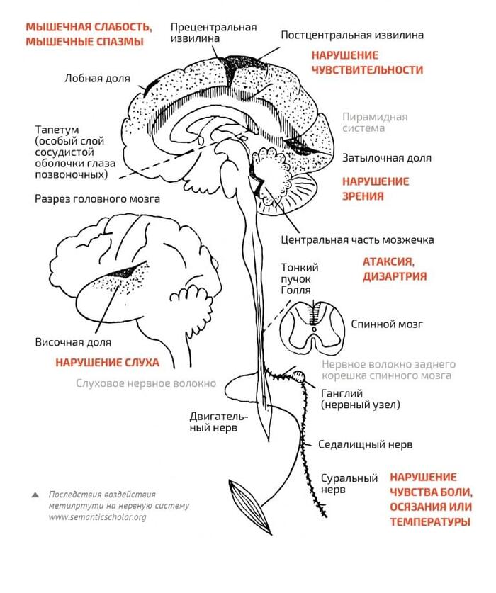Цистеин входит в состав белков-ферментов, в том числе пищеварительных и обезвреживающих токсины, а главное – многие белки держат свою форму и структуру как раз за счет мостиков из тиоловых групп цистеина. «Убиваем» тиоловую группу – белок меняет форму и больше не может выполнять свою работу. Кроме того, именно способность связываться с цистеином делает метилртуть особенно опасной для нервной системы. Сев на хвост аминокислоте, токсин вместе с ней спокойно проходит через гематоэнцефалический барьер – фильтр, установленный в сосудах головного мозга и обычно защищающий его от отравляющих веществ и агрессии со стороны иммунитета. Поэтому симптомы поражения нервной системы у жителей Минамата проявлялись гораздо ярче, чем это обычно происходит при отравлениях ртутью.