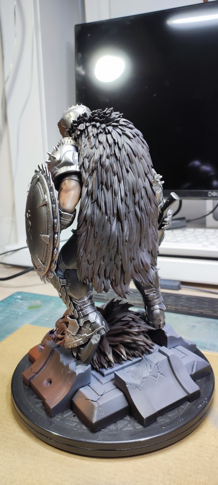 Отдельным проёбом приёмом оказались эти вот живописные жёлто-оранжевые отблески золотого дождя бликов от якобы источника огня где-то снизу справа. Каждый элемент брони, будь то кожаные поножи или крашеные стальные наплечники\нагрудник, были аккуратно поддуты из аэрографа желто-красным градиентом. Получилось... Ну вот как-то. С одной стороны - да, на Думгая светит чем-то оранжевым откуда-то снизу. С другой стороны, на Палаче Рока явно оставили след обоссывающиеся от ужаса демоны. ЧТО делать с мочевым камнем этим ощущением? Решил затемнить остальные части фигурки позднее.
