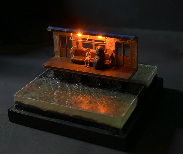И вот. спустя этап смывок и лакировки фигурка готова к финальному этапу - КРОВИЩИ! Гурятину я намешал из жижи "нефтяное пятно" и алой масляной краски. Прикол этой жижи в том, что она застывает глянцевыми каплями и потёками на поверхности, и, если необходимо - абсолютно бесследно убирается уайт-спиритом. То есть можно хулиганить по-полной, так как Ctrl+Z завезли ( если вы понимаете о чём я). Набрызгал гурятину, превратил просто статуэтку в произведение кровавого антиискусства, кинул черную тряпочку на фон, поставил пару настольных ламп по бокам, и погнали фотографировать итог на китайский телефон... Приятного просмотра!