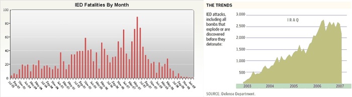 На 2007 год пришелся пик использования СВУ в Ираке, и, соответственно, пик потерь от них. К концу 2007 года, согласно наставлению армии США по борьбе против СВУ («MNC-1 Counter IED Smart Book») [2] 40% потерь армии США было вызвано применением СВУ. Журналисты Washington Post[7] и сайт icasualties.org[6], публикующий сведения о всех погибших американских военнослужащих, представили другие данные- 63% погибших и 69% раненых.