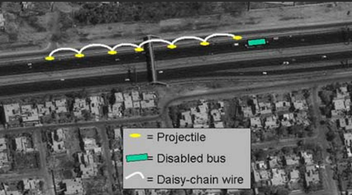Одна из распространенных схем минирования- «гирлянда» из взрывных устройств, рассчитанная на поражение колонны. Зеленым обозначен «заглохший» автобус, желтым- СВУ на обочине (https://www.globalsecurity.org/military/intro/ied-iraq.htm).