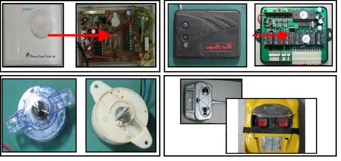 Использованные в качестве взрывателей беспроводной дверной звонок (слева сверху), таймеры от стиральных машин (слева снизу), блок автомобильной сигнализации с брелком (справа сверху), пульт от радиоуправляемой игрушки (справа снизу).