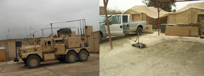 Слева- MRAP с установленными антеннами джаммеров, справа- iRobot Packbot.