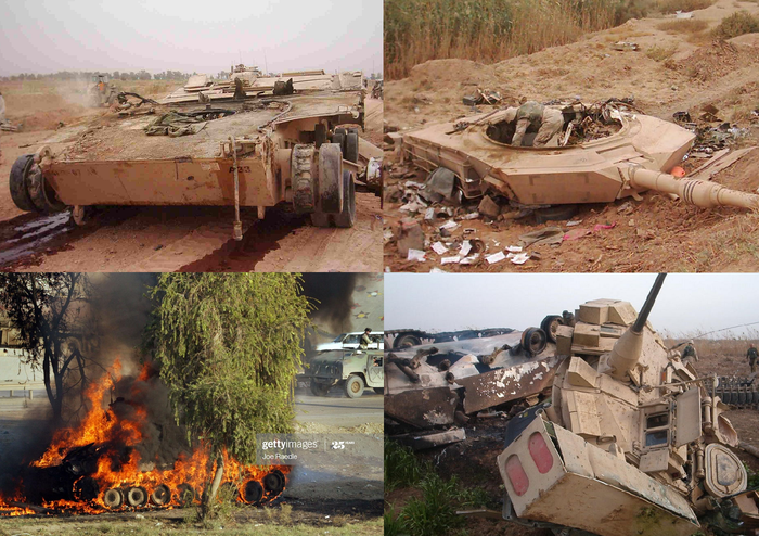 Потери бронетехники также были значительны. Одних только танков Abrams различных модификаций было потеряно 4 шт., причем 2 из них от СВУ с ударным ядром :