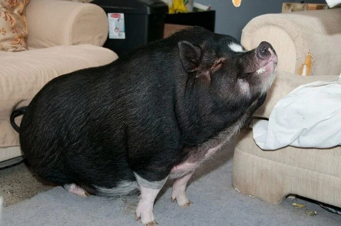 История банальная: купили мини-пига, а оказался обычный хрюша. Жил в квартире, на поводке гулял.