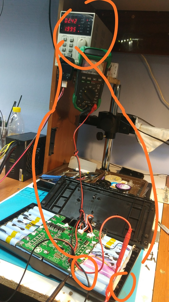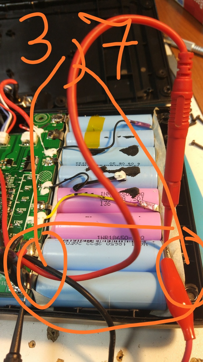 Щупами мульмитетра смотрим напряжение, грубо говоря на каждой паре должно быть по 3.7 вольта (не менее 3.6, согласно спецификациям от самсунга и lg акб, с напряжение ниже 2в (или 2,2 поправьте кто точнее скажет) подлежит замене).