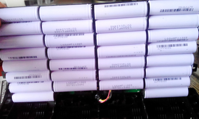 Внимание! В аккумуляторе напряжение 63 вольта! При случайном коротком замыкании элементов - можно получить нехилый термический ожог. Элементы 18650 взрываются про коротком замыкании. Эффект как от петарды аналогичного размера. Внимательно!