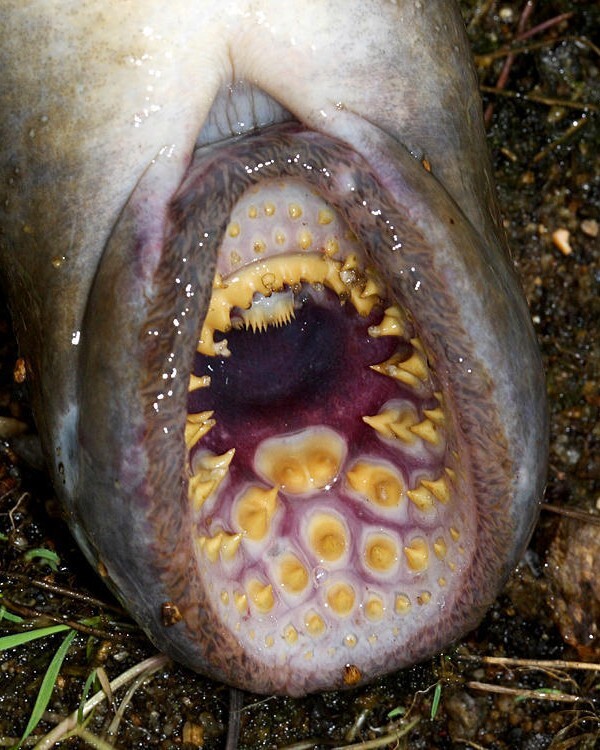 Но самое интересное у миног – это рот. С таким ртом им прямая дорога в книги Лавкрафта. Начнем изнутри. Глотку предваряет рот миноги, который расположен да дне предротовой воронки. В центре воронки находится язык с зубами типа терки, по всей внутренней поверхности предротовой воронки расположены роговые зубы, которые служат для фиксации миноги на теле жертвы.