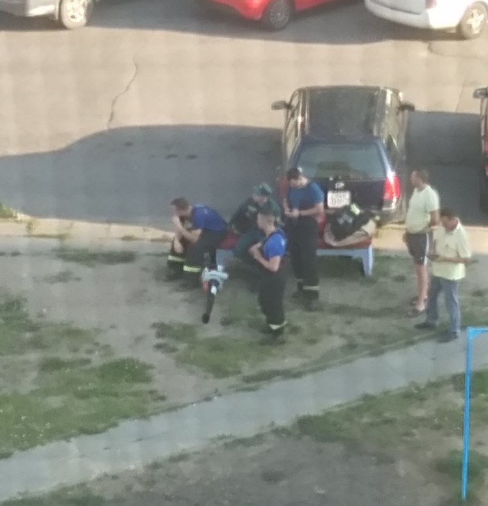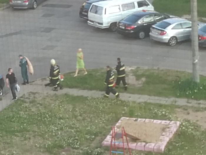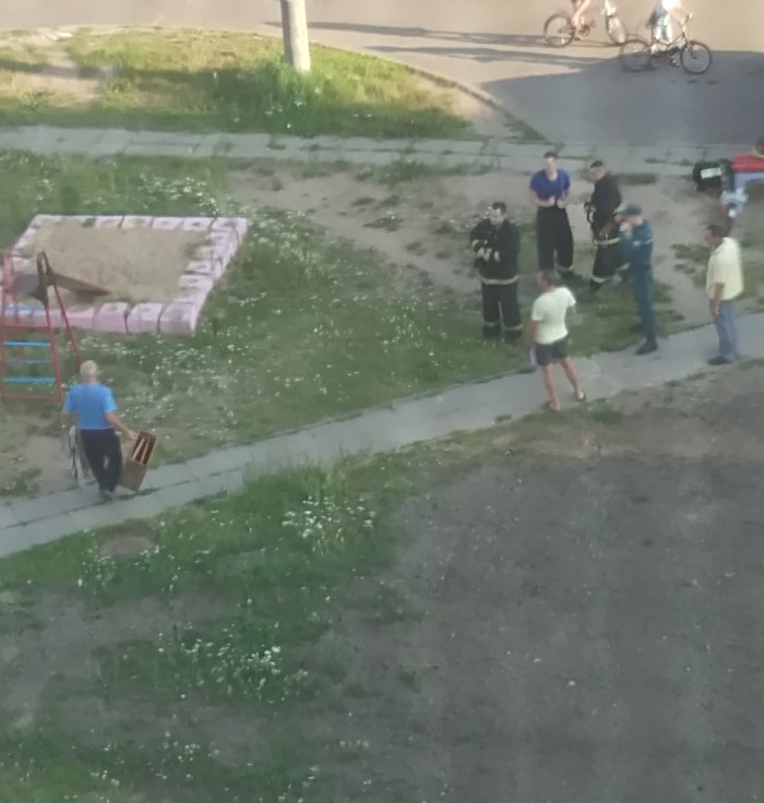 Только мы успели опечалиться, как позвонил сотрудник МЧС, убедился что заявку оставила именно я, уточнил что таки пчёлы и попросил скинуть ему фотки в вайбер, если оные имеются в наличии. Фотки имелись, вайбер нет, но по такому случаю и приобщиться к фиолетовой сети не жалко. Скинула, проверила что номер верный и утроилась в наблюдательном пункте (на балконе, оттуда вид на плошадку отличный) собственно наблюдать. Довольно быстро приехала пожарная машина, которая привезла четверых бравых спасателей, которые, в свою очередь, извлекли из машины немаленький такой пылесос и мешок к нему, в который при желании влез бы человек средних размеров.