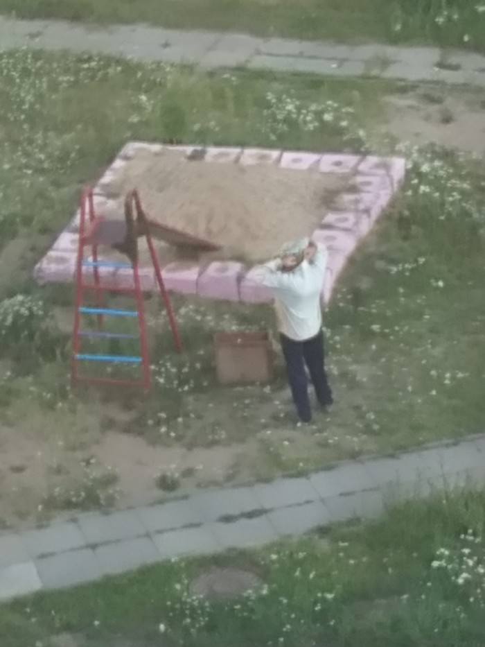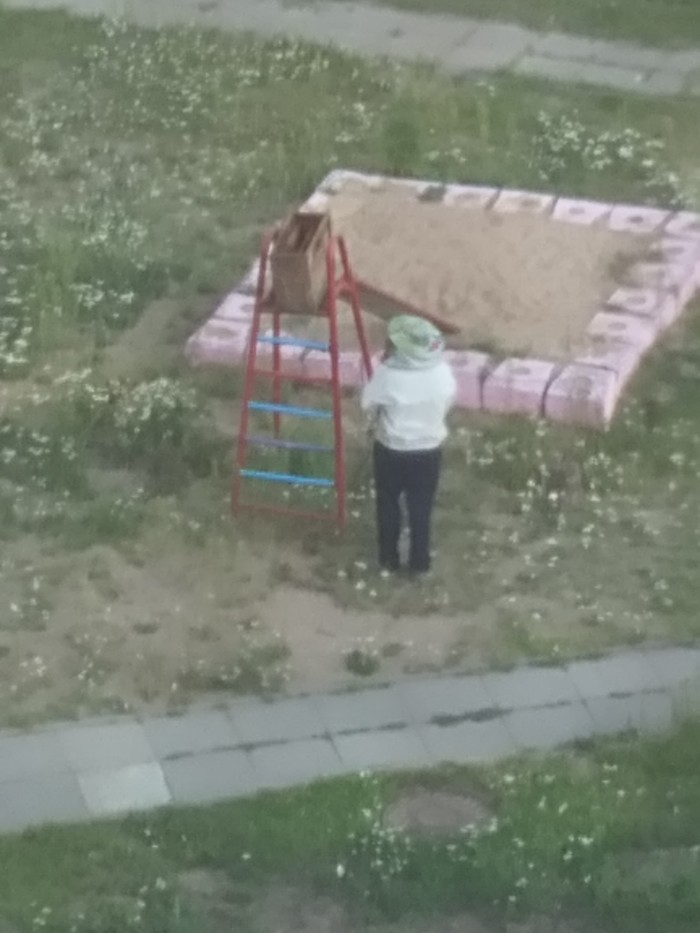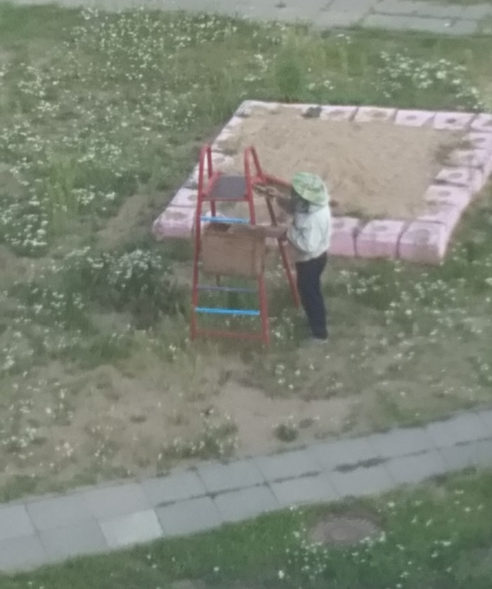 Пчёлы были растеряны, перепуганы и совершенно неагрессивны (и скорее всего есть хотели, цветов у нас во дворе отродясь не было, да и не разлетались они в поисках пищи), люди спокойно проходили по дорожке мимо и даже не замечали, что в метре от них тусуется килограммов 10 пчелиной массы. Но всякое бывает, интернет захлебывается историями об анафелактических шоках, отёках Квинке и смертях от укусов (сама аллергик, поэтому было особенно боязно), да и детская площадка как-никак, уж дети не упустят возможности во что-нибудь вляпаться или палкой ткнуть.