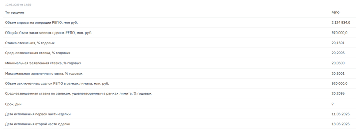 📌 С учётом инфляционных данных и при таком спросе, план перевыполнили. Проблема состоит в том, что при таких тратах бюджета занимать в ОФЗ необходимо больше, ибо курс ₽ крепок, а скачок нефти из-за конфликта Ирана и Израиля иссяк (займ через ОФЗ по сути эмиссия денег, т.к. кредит банков = рост М2, опять же раскрутка инфляции). Опять же ликвидности банкам не хватает, очередной недельный аукцион РЕПО это показал (спрос был в 2,4₽ трлн, ЦБ выдал только1,1₽ трлн, в июне банки привлекли 3,650₽ трлн, отдали 2,540₽ трлн).