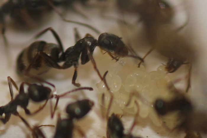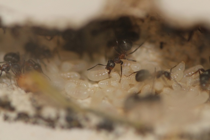6 января отметил, что пакет яиц стал ещё больше. Крупный пакет яиц в мандибулах держала матка, а маленький прятал рабочий. Возможно, уже появились маленькие личинки, не стал сильно тревожить семью, чтобы рассмотреть, они очень сильно паникуют при каждом кормлении/касании к инкубатору.