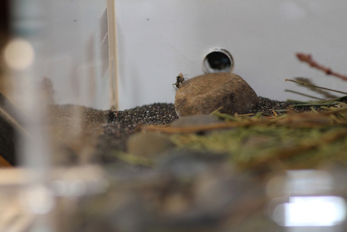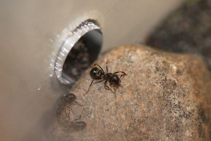 Буквально в эту же минуту первый разведчик вышел обследовать новые территории. Обошел земли кругом и вернулся внутрь, сообщить остальным, что он видел. И сразу же после этого герки начали работать над обороной гнезда. Парочка муравьев пошла таскать камни с арены и складывать в инкубаторе в месте примыкания с трубкой, создавая насыпь. Приятно наблюдать за работой муравьев. Причем когда работают такие крупные муравьи, то отчетливо слышишь, как они тягают эти камушки, стуча ими друг об друга.