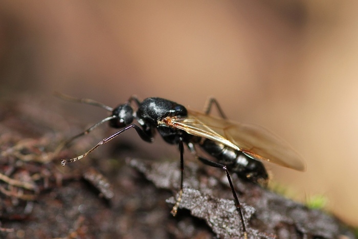 Поначалу никаких признаков лёта я не наблюдал, однако чуть позже из гнезда вышел один-единственный крылатый самец. Он побродил по округе, пораскрывал крылья несколько раз, словно примериваясь к полету, попозировал на камеру, а потом вернулся в муравейник.