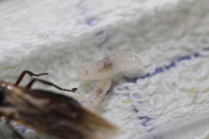 16 февраля – одна личинка очень сильно выросла (она выделяется и на прошлом фото, но еще не так явно), ещё есть несколько крупных и средних. Так же матка отложила ещё и несколько яиц. Интересно. Крылья так и не сбросила.