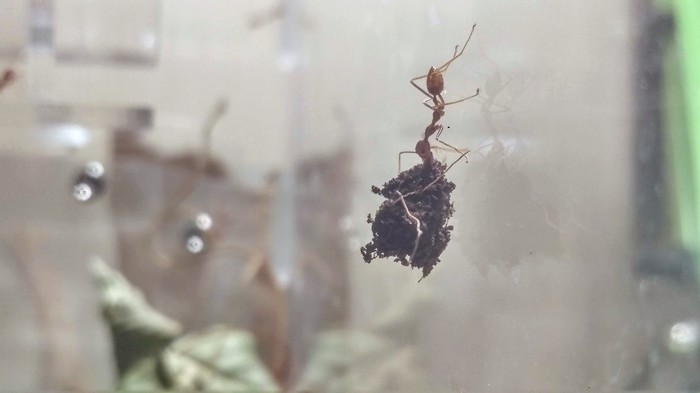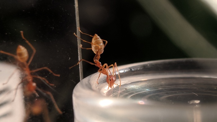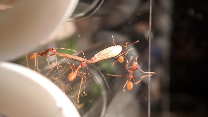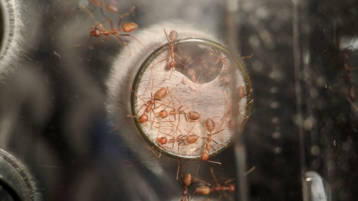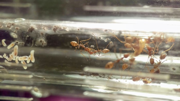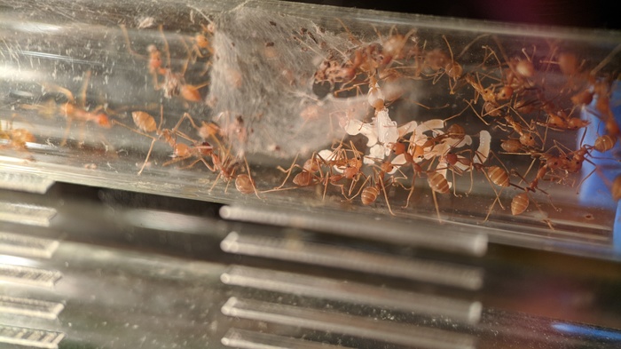 Обратил внимание, что муравьи практически перестали плести шелк. Перегородки в пробирке поистрепались, никто не занимался их восстановлением. Подумал, что это как-то связано с тем, что давно не давал им сироп. Похоже, что это сработало, потому как портнячество возобновилось. =)