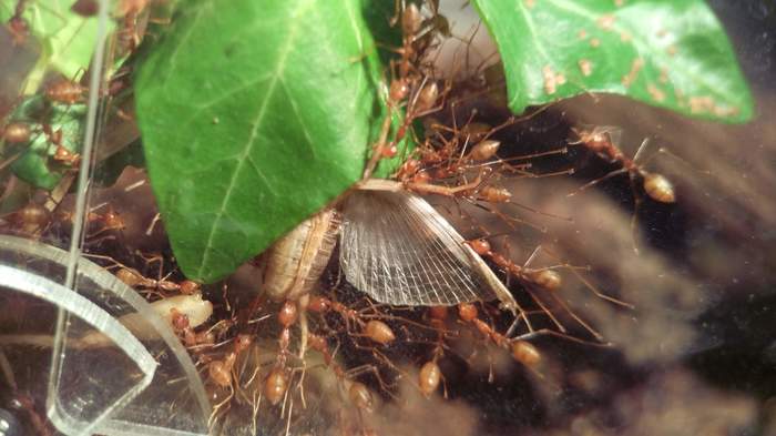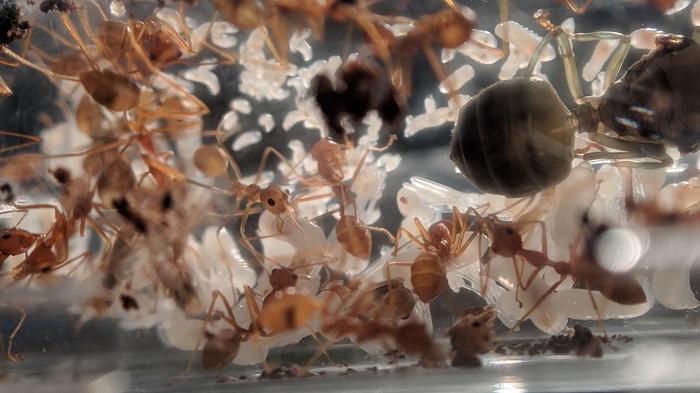 Мокриц набрал в парке под парой бесхозных чурок. И сперва, когда мокрицы были подселены, всё говорило о том, что мураши с ними будут жить в мире, но уже через три дня они жестоко расправились c первой из них.