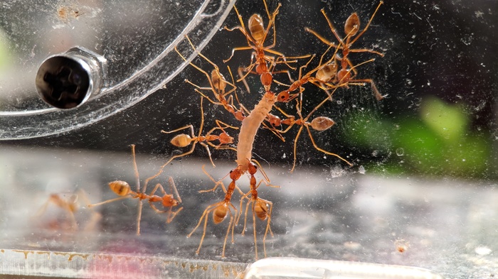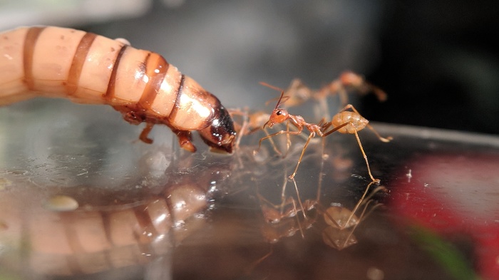 Доставать его не стал, благо имелась подходящая замена: личинки жука-знахаря. Можно сказать, что это уменьшенная копия мучного червя. Вот на неё мураши реагировали более активно.