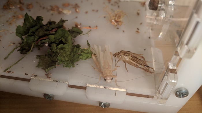 В какой-то из дней решил повторить эксперимент с подселением сверчка. В этот раз заселил его в формикарий. Места там много, чувствовал себя он довольно комфортно. А я случайно выяснил, что сверчки, оказывается, очень даже с аппетитом едят сушеный гаммарус.