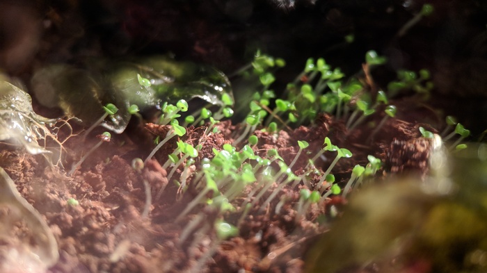 К моему глубочайшему сожалению плющ, который так органично украшал формикарий начал увядать. Возможно таракан подъел корни или просто не прижился, но я начал искать замену, чтобы было зелено-красиво. Посыпал семенами, вскоре взошла травка: