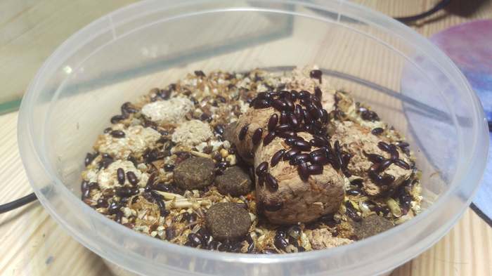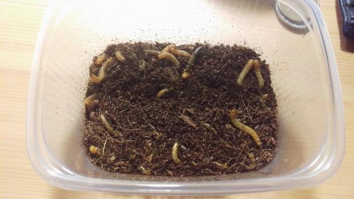 Личинки знахаря - довольно популярная кормовая культура среди мирмикиперов. Для их содержания практически ничего не нужно: контейнер да что-то, что жуки эти будут поедать. Самостоятельно жуки из контейнера выбраться не могут. Откуда их взять, этих жуков-знахарей? У товарищей-мирмикиперов. =) Во всяком случае так я получил своих. А кроме них еще и культуру ногохвосток, гипоасписа и тропических мокричек. Это было крайне неожиданно и приятно, что в Клубе Любителей Муравьев есть такие отзывчивые люди. =)