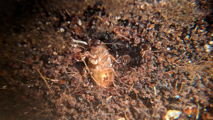 Предполагаю, что это тот таракан, которого случайно мураши упустили. Он был придавлен пинцетом изначально, но всё равно выжил, похоже, и довольно комфортно обосновался в субстрате. Наружу он не вылезает. Умный, зараза, знает же, что там снуют туда-сюда охотники мурашей.