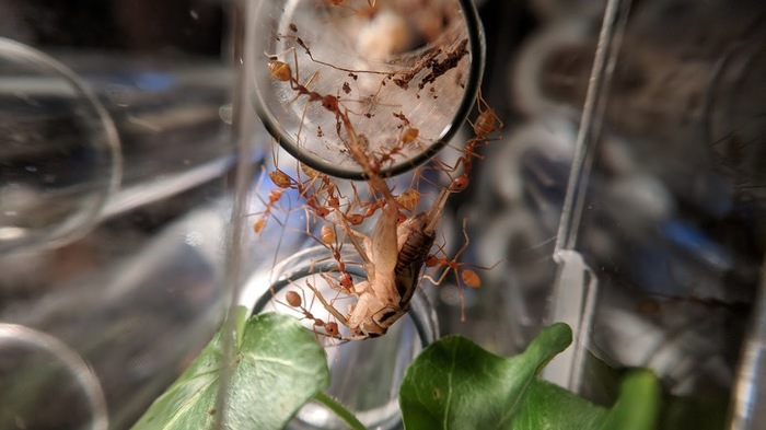 Я подумал, причина кроется в том, что очень уж колония голодная, и от того начала опускаться до поиска пропитания в земле. Что ж, цель поставлена - накормить колонию, чтобы все спокойно уживались. Для того вновь был приобретен сверчок. Уже привычное лакомство для мурашей, но вы еще не видели, как они его затаскивают в пробирку. А вот так: