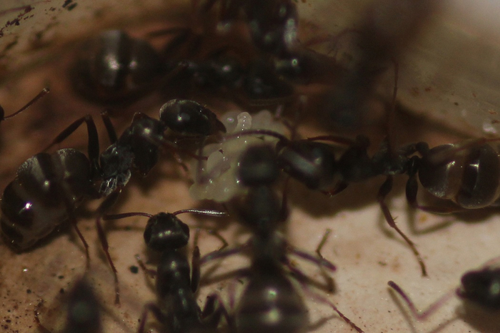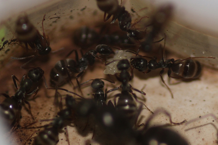 Я сразу же подключил новый инкубатор для путешественников, и в новом гнезде разместил плошку с сиропом, а за ней – расплод от почившей самки (шесть личинок). Муравьи сначала жадно напились сиропа, а затем принялись активно забирать расплод себе. Мигом перетащили всех личинок. Так же в новом инкубаторе разместил личинку жука-знахаря, ее тоже быстренько пустили в дело, отнесли к матке, которая начала на пару с работягой разделывать добычу.