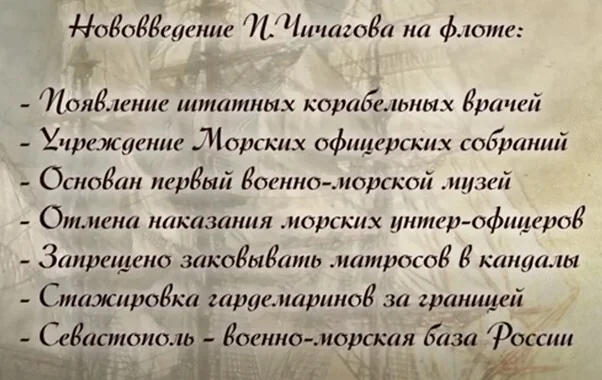 Флот наш жил ещё по Петровским законам, которые тот перенял у голландцев. Довольно суровые законы были с кучей телесных наказаний, казнями, да и в целом служба во флоте считалась чем-то очень опасным, рисковым и нифига не таким же престижным, как военная карьера на суше. Учредив первый в России Военно-Морской музей и организовав офицерские морские собрания Чичагов повысил престиж службы во флоте и романтизировал эту профессию.