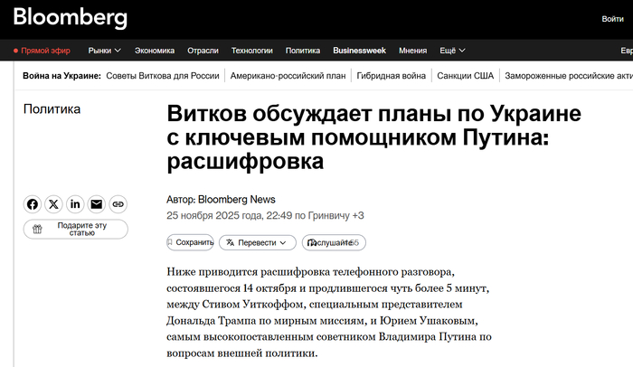 И если эта статья Bloomberg не фейк, то мы теперь точно знаем, что мирный план разработан в интересах России, а Уиткофф намного более "пророссийский", чем предполагалось.