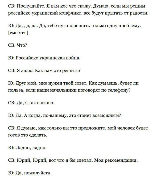 Итак, газета пишет, что ей в руки попал телефонный разговор между спецпредставителем Трампа Стивом У(В)иткоффом (СВ) и помощником президента России - Юрием Ушаковым (Ю).