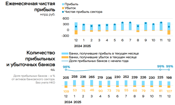 💳 По данным ЦБ, в декабре 2025 г. прибыль банков составила 176₽ млрд (-4,4% г/г, в ноябре — 394₽ млрд), по сравнению с прошлым годом незначительное снижение — 187₽ млрд в декабре 2024 года (напомню, что тогда была отрицательная переоценка валюты в -120₽ млрд и высокое премирование персонала из-за повышения налог на прибыль в 2025 году). Также отмечаю, что доходность на капитал в декабре снизилась с 23,9 до 10,5%. Теперь приступим к интересным фактам из отчёта: