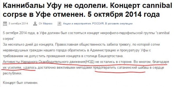А между тем это ведь основная деятельность башкирских нодовцев – на что-нибудь нажаловаться, что-нибудь позапрещать. Конечно, во славу Великой России, именем Путина, дай Бог ему бессмертия. Например, выступить не только против концерта металлистов, но и, например, против замечательного граффити, изображающего танцующую башкирскую девушку – ту самую, которая все-таки появилась на доме напротив «Мегаполиса». Несмотря даже на их первобытный вой – мол, это фривольное изображение задевает честь мусульманской девушки. Тогда их влияния не хватило, а вот запретить выступление «сатанинской» группы – это они могут это пожалуйста. Чиновники ведь у нас трусливые – «как бы чего не вышло» - идут на поводу у мракобесов, размахивающих георгиевскими ленточками.