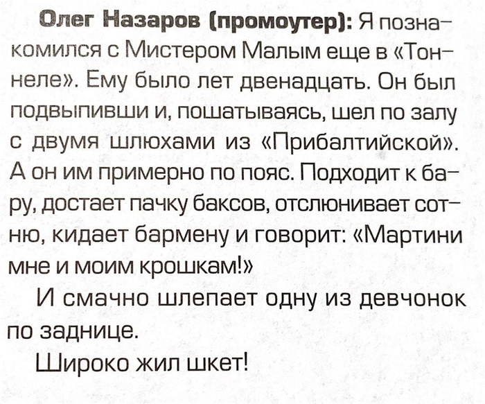 В центре Андрей Цыганов "Мистер Малой" (1992 год). Мистер Малой — один из первых российских рэперов, ставший для многих главной ассоциацией со словом «рэп». В 1992 году записал хит «Буду погибать молодым» и проник в эфиры центральных телеканалов и радиостанций страны. Первый концерт состоялся в 1992-м в ДК им. Ленсовета, его творчество было хорошо воспринято. Потом снял клип «Буду погибать молодым» за 150 долларов. В 1994 году занял второе место на всероссийском фестивале «Поколение-94», в 1995 году по мнению большинства деятелей музыкальной индустрии был назван «Лучшим артистом года». Позднее основной русскоязычный рэп-ресурс, Rap.ru, включил альбом «Буду погибать молодым» в список «Главные альбомы русского рэпа». Альбом «Буду погибать молодым» разошёлся многомиллионным тиражом и был неоднократно переиздан.На первой волне популярности в 90-е Цыганов бросил школу и пристрастился к алкоголю и наркотикам. Пагубные привычки сыграли с певцом злую шутку - уже к концу 90-х контракт с продюсером певца был расторгнут, гастрольная деятельность прекратилась, а доходы с последующих альбомов были незначительные.(Википедия).