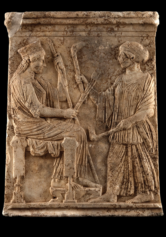 Деметра восседает на троне и благословляет коленопреклоненную Метанейру, которая предлагает триединую пшеницу (ок. 340 до н.э.)