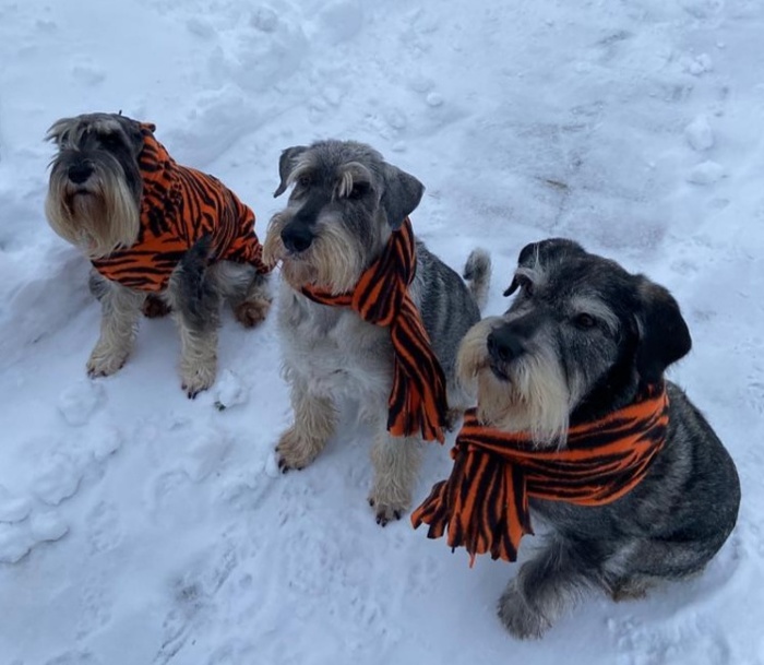 Возрастной ризеншнауцер из Оренбурга Михась, о котором мы тоже тут рассказывали в конце прошлого года, переехал на передержку в Тверскую область в дружную и бравую компанию кобелей. Михася переименовали в Даньку, лапу ему долечили, нос у парня зарос, вес набрался, он существенно взбодрился и повеселел, активно играет и прекрасно себя чувствует. Вот трио собирающихся на прогулку в холодную ветреную погоду на берег Волги, все в модных попонках шоб не продуло. Данька в центре, у него пока все фотографии динамичные и в массовке, вот приедет к нему фотограф, устроим похорошевшему личную фотосессию.