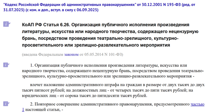 Музыкантов при использовании такой лексики на концертах могут привлечь за «хулиганство». Но закон не подразумевает запрет или цензуру артистов.