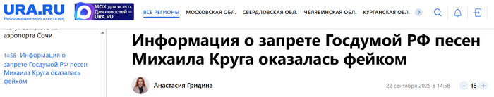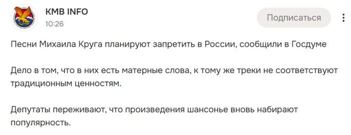 Однако отметим, что это лишь частное мнение. Ни на официальном портале правовой информации, ни на официальном сайте Госдумы РФ нет сообщений об ограничении или запрете репертуара Михаила Круга. Ранее «Лапша Медиа» опровергла похожий фейк о запрете группы «Сектор Газа» в России.