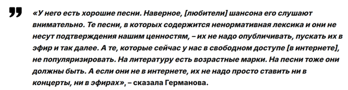 «У него есть хорошие песни. Наверное, [любители] шансона его слушают внимательно. Те песни, в которых содержится ненормативная лексика и они не несут подтверждения нашим ценностям, – их не надо опубличивать, пускать их в эфир и так далее. А те, которые сейчас у нас в свободном доступе [в интернете], не популяризировать. На литературу есть возрастные марки. На песни тоже они должны быть. А если они не в интернете, их не надо просто ставить ни в концерты, ни в эфирах», – сказала Германова.